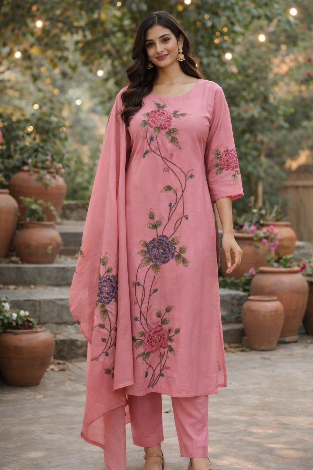 Graceful pink mul chanderi kurta set with delicate floral embroidery and matching dupatta for elegant festive wear.