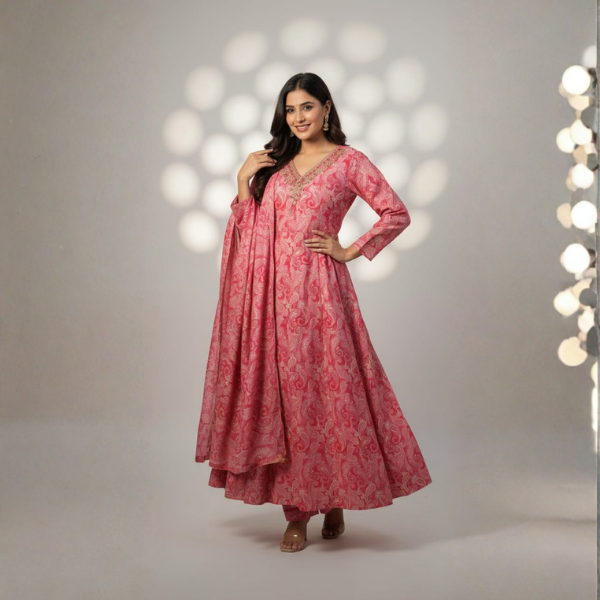 Beautiful pink Anarkali kurta set featuring rich traditional prints and a flowy silhouette with a matching dupatta. Perfect for festive and special occasions.