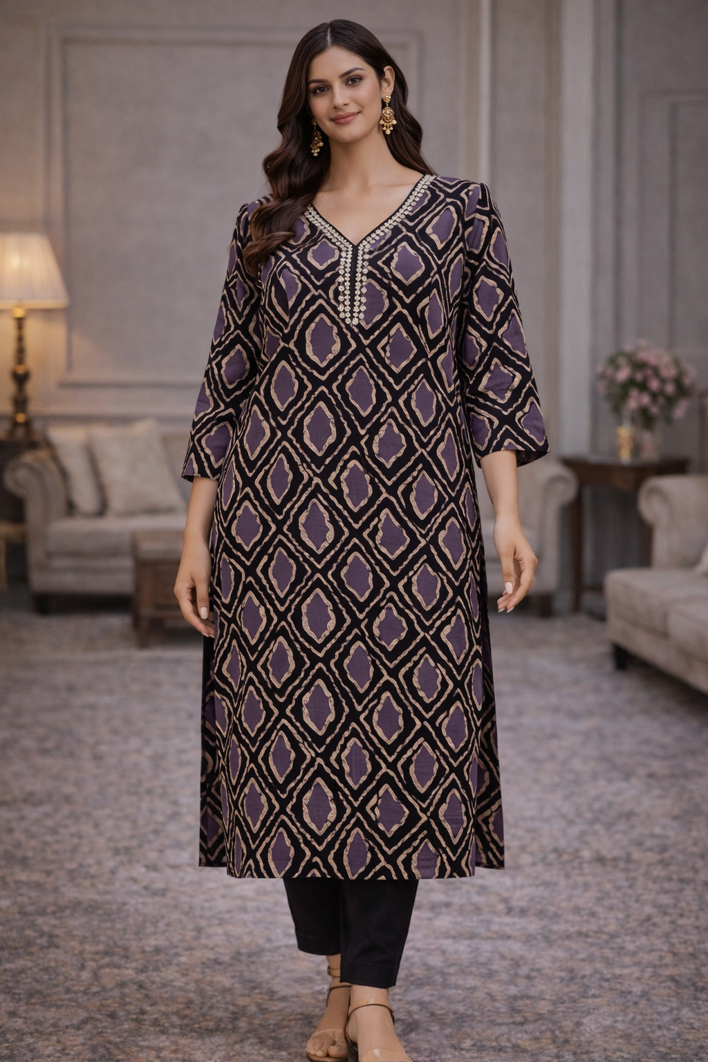 This purple and black printed cotton kurta set is perfect for women who want comfort with a neat, traditional look. Made from soft cotton fabric, it feels light on the skin and is easy to wear all day.